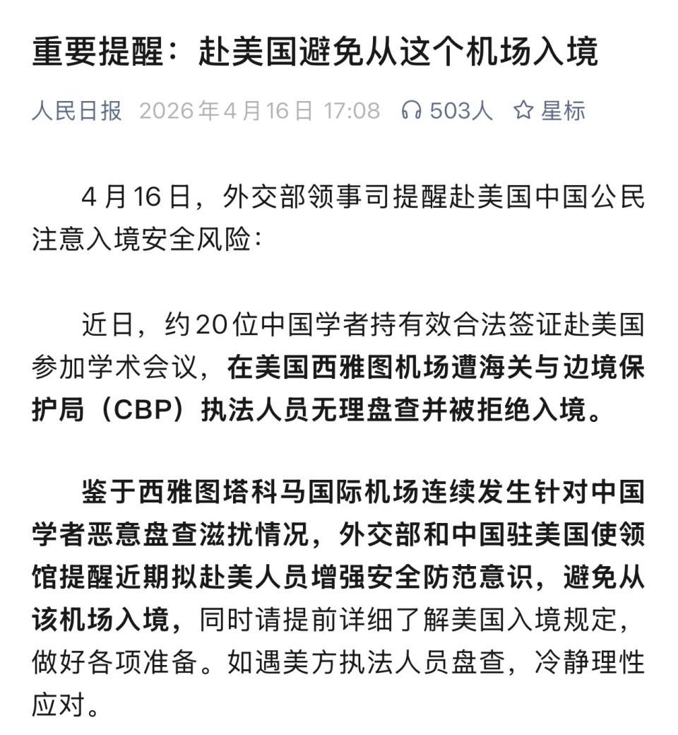 不仅如此,西雅图的这座机场已经连续发生针对中国学者的恶意盘查滋扰,因此,外交部和中国驻美国使领馆提醒,近期拟赴美人员避免从该机场入境。
